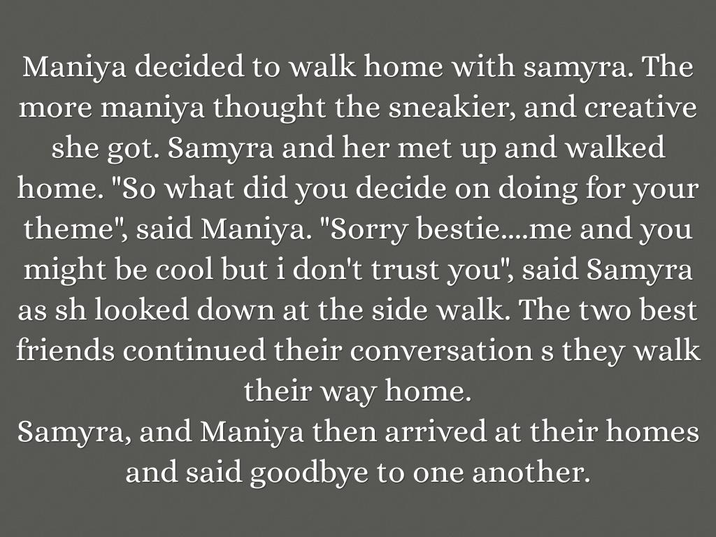 Maniya decided to walk home with samyra. The more maniya thought the sneakier, and creative she got. Samyra and her met up and walked home. "So what did you decide on doing for your theme", said Maniya. "Sorry bestie....me and you might be cool but i don't trust you", said Samyra as sh looked down at the side walk. The two best friends continued their conversation s they walk their way home.