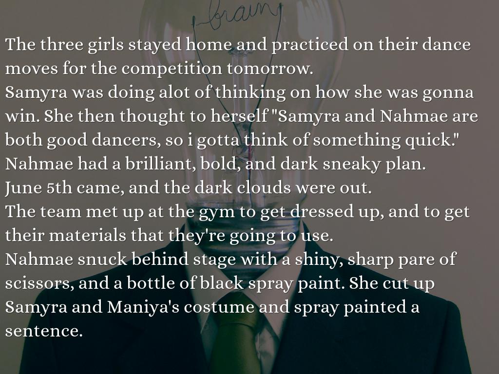 Nahmae snuck behind stage with a shiny, sharp pare of scissors, and a bottle of black spray paint. She cut up Samyra and Maniya's costume and spray painted a sentence.