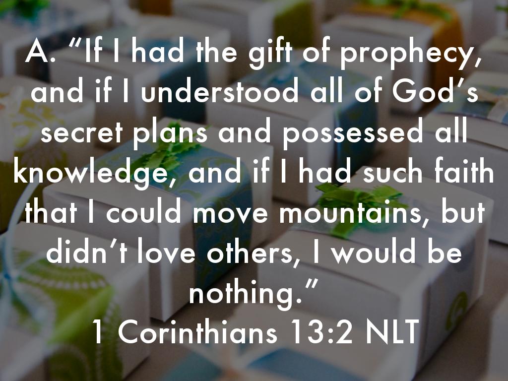 A. “If I had the gift of prophecy, and if I understood all of God’s secret plans and possessed all knowledge, and if I had such faith that I could move mountains, but didn’t love others, I would be nothing.” 1 Corinthians 13:2 NLT