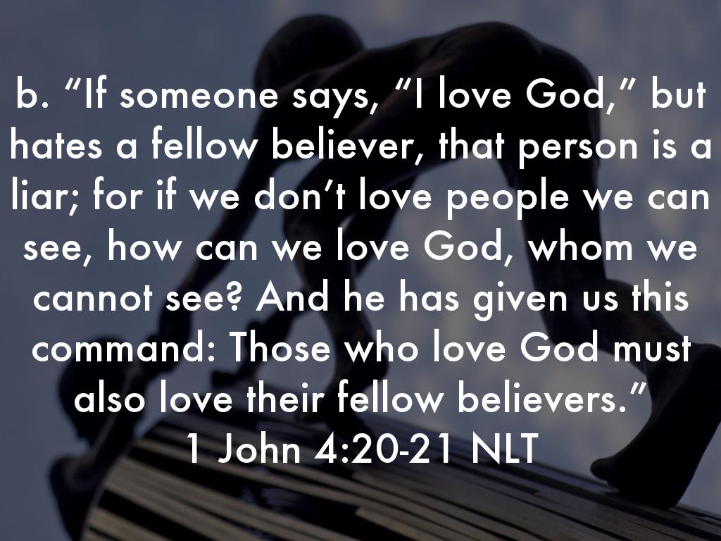 b. “If someone says, “I love God,” but hates a fellow believer, that person is a liar; for if we don’t love people we can see, how can we love God, whom we cannot see? And he has given us this command: Those who love God must also love their fellow believers.” 1 John 4:20-21 NLT