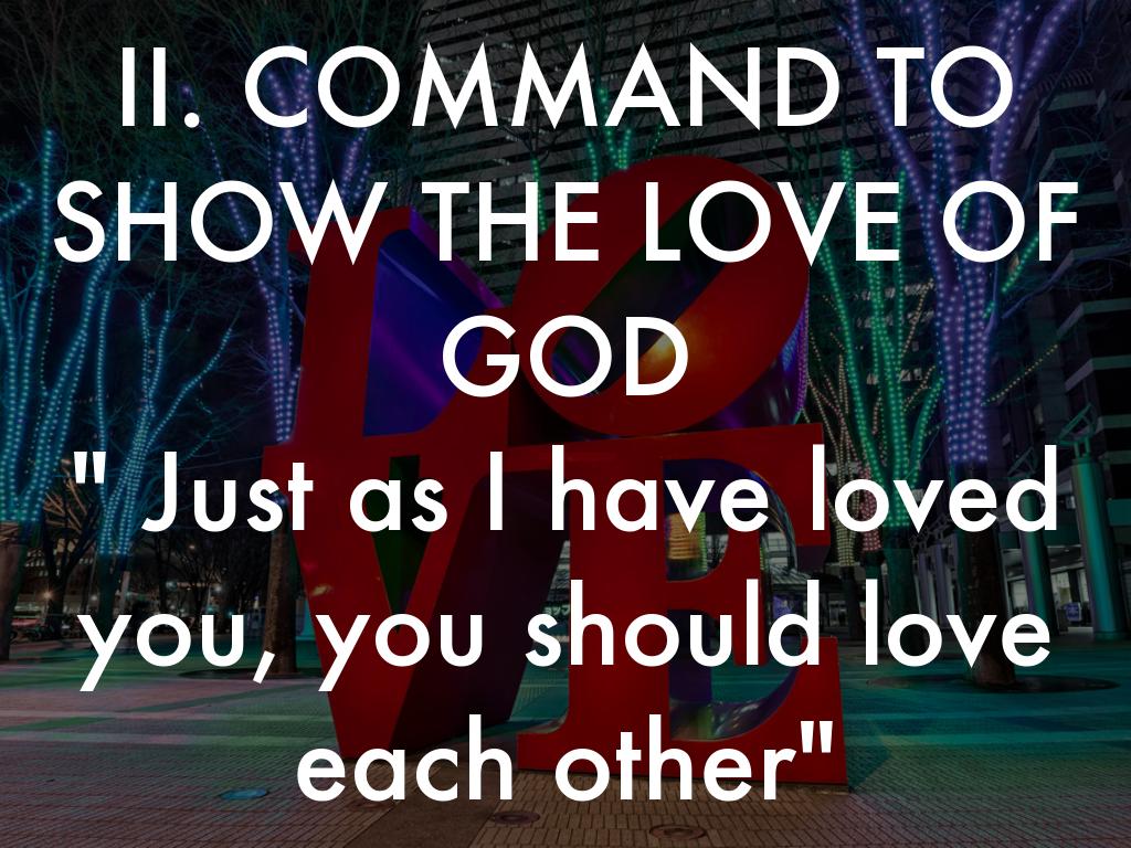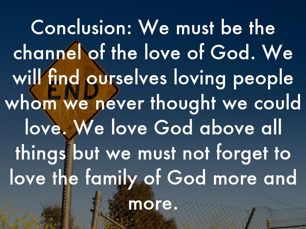 Conclusion: We must be the channel of the love of God. We will find ourselves loving people whom we never thought we could love. We love God above all things but we must not forget to love the family of God more and more.