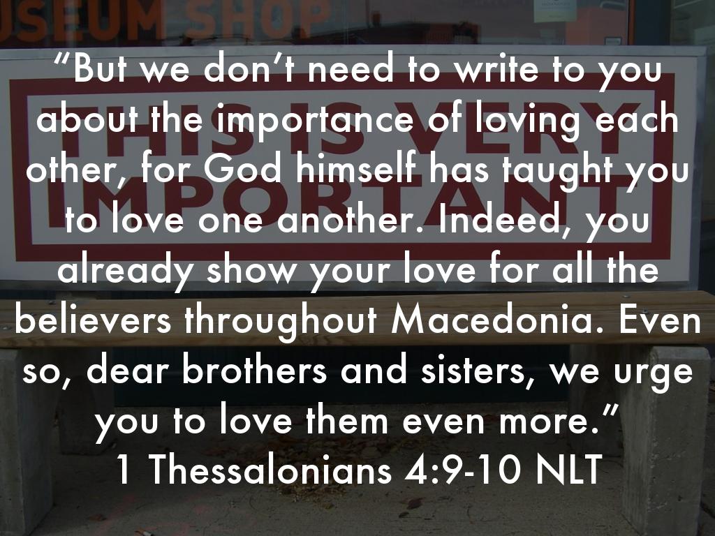 “But we don’t need to write to you about the importance of loving each other, for God himself has taught you to love one another. Indeed, you already show your love for all the believers throughout Macedonia. Even so, dear brothers and sisters, we urge you to love them even more.” 1 Thessalonians 4:9-10 NLT
