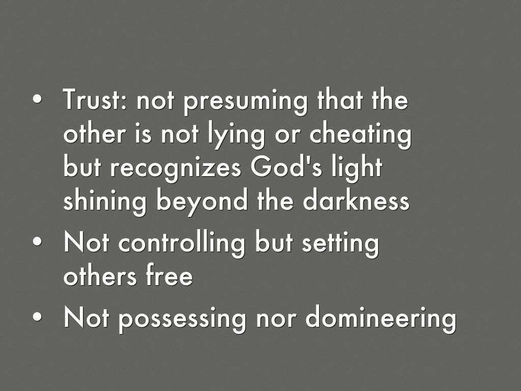 Trust: not presuming that the other is not lying or cheating but recognizes God's light shining beyond the darkness