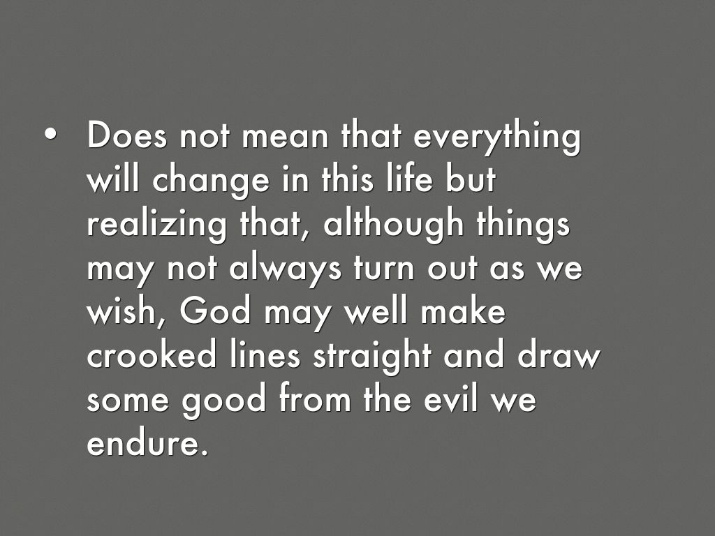 Does not mean that everything will change in this life but realizing that, although things may not always turn out as we wish, God may well make crooked lines straight and draw some good from the evil we endure.