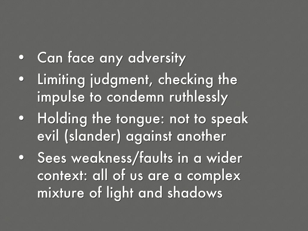 Sees weakness/faults in a wider context: all of us are a complex mixture of light and shadows