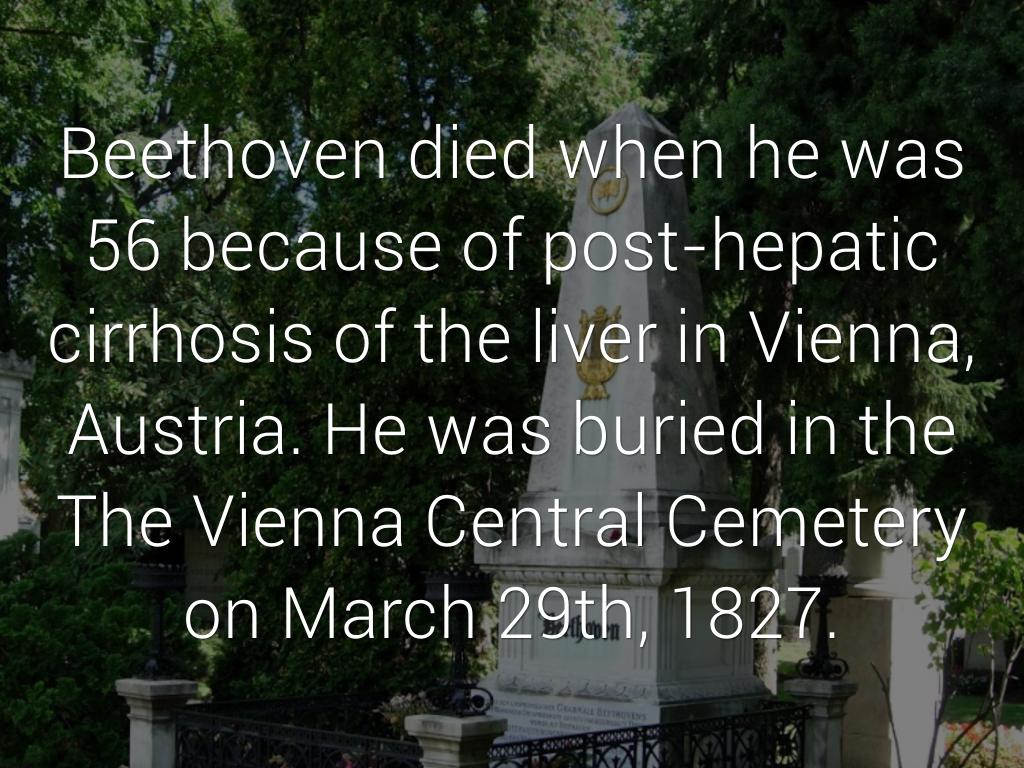 Beethoven died when he was 56 because of post-hepatic cirrhosis of the liver in Vienna, Austria. He was buried in the The Vienna Central Cemetery on March 29th, 1827.