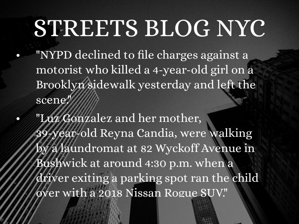 "Luz Gonzalez and her mother, 39-year-old Reyna Candia, were walking by a laundromat at 82 Wyckoff Avenue in Bushwick at around 4:30 p.m. when a driver exiting a parking spot ran the child over with a 2018 Nissan Rogue SUV."