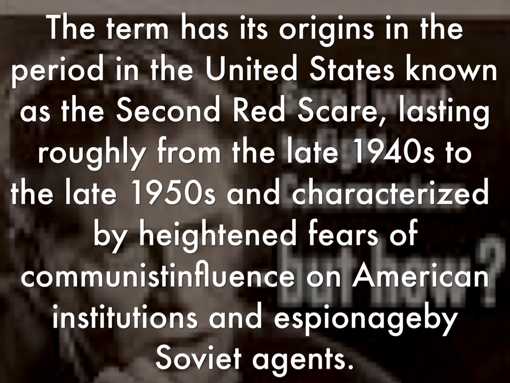 The term has its origins in the period in the United States known as the Second Red Scare, lasting roughly from the late 1940s to the late 1950s and characterized by heightened fears of communistinfluence on American institutions and espionageby Soviet agents.