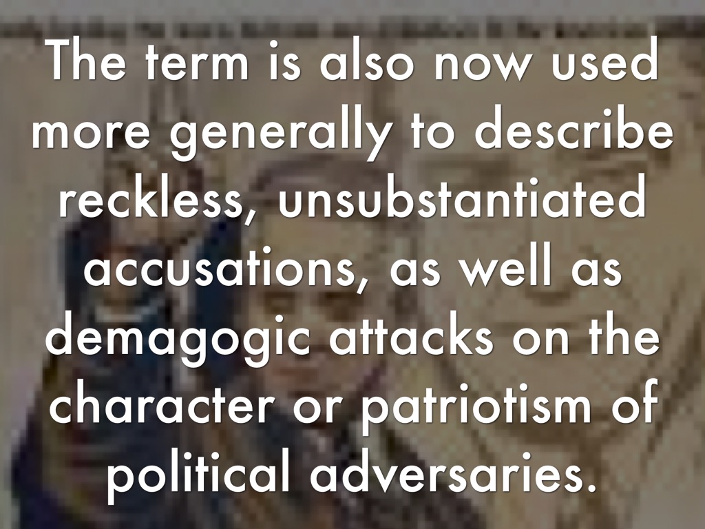 The term is also now used more generally to describe reckless, unsubstantiated accusations, as well as demagogic attacks on the character or patriotism of political adversaries.