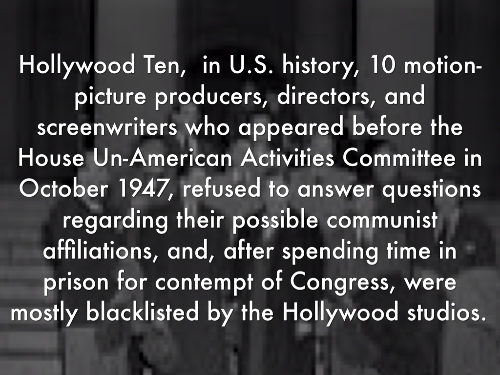 Hollywood Ten, in U.S. history, 10 motion-picture producers, directors, and screenwriters who appeared before the House Un-American Activities Committee in October 1947, refused to answer questions regarding their possible communist affiliations, and, after spending time in prison for contempt of Congress, were mostly blacklisted by the Hollywood studios.