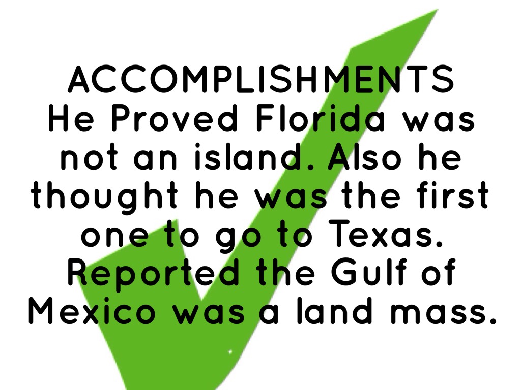 He Proved Florida was not an island. Also he thought he was the first one to go to Texas. Reported the Gulf of Mexico was a land mass.