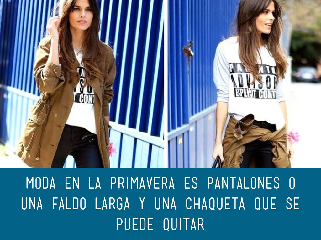 Moda en la primavera es pantalones o una faldo larga y una chaqueta que se puede quitar