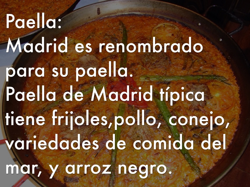 Paella de Madrid típica tiene frijoles,pollo, conejo, variedades de comida del mar, y arroz negro.