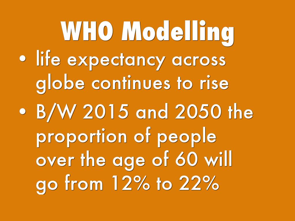• B/W 2015 and 2050 the proportion of people over the age of 60 will go from 12% to 22%