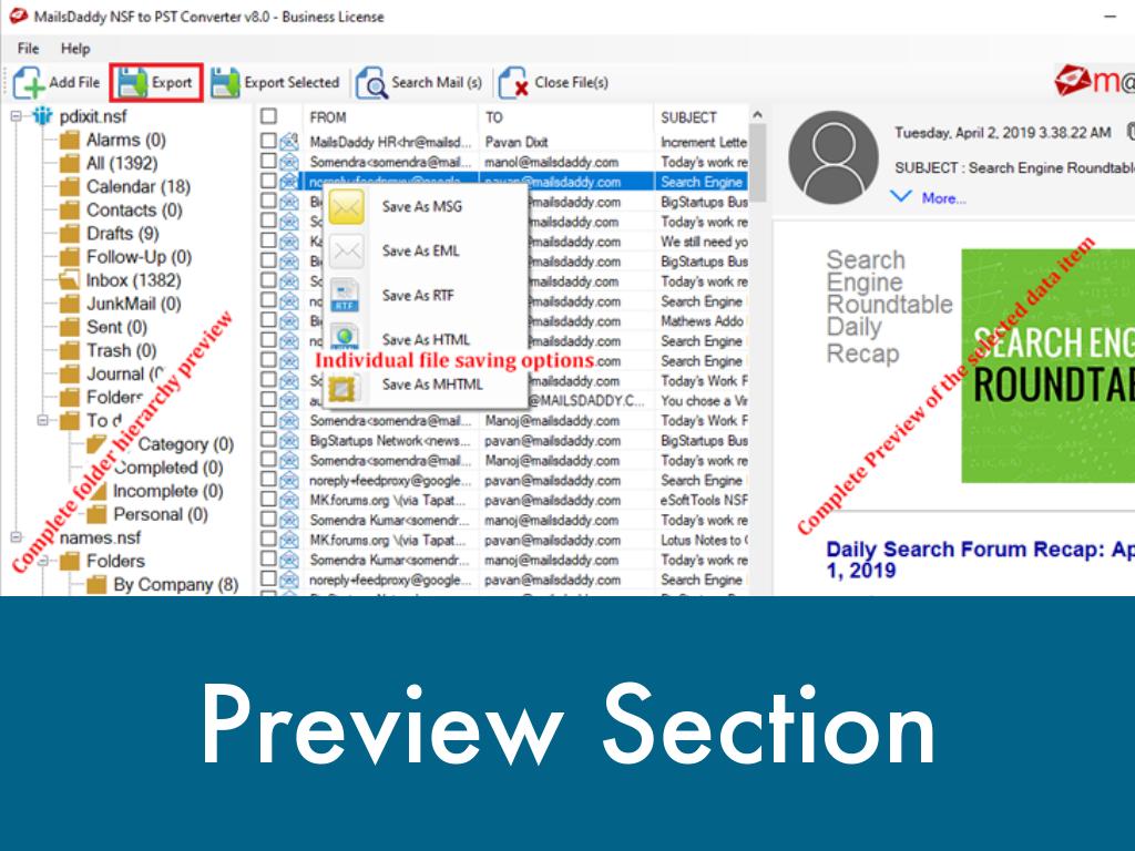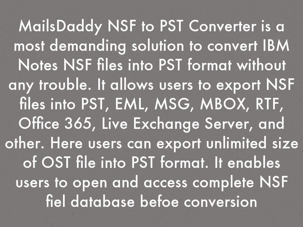 MailsDaddy NSF to PST Converter is a most demanding solution to convert IBM Notes NSF files into PST format without any trouble. It allows users to export NSF files into PST, EML, MSG, MBOX, RTF, Office 365, Live Exchange Server, and other. Here users can export unlimited size of OST file into PST format. It enables users to open and access complete NSF fiel database befoe conversion.