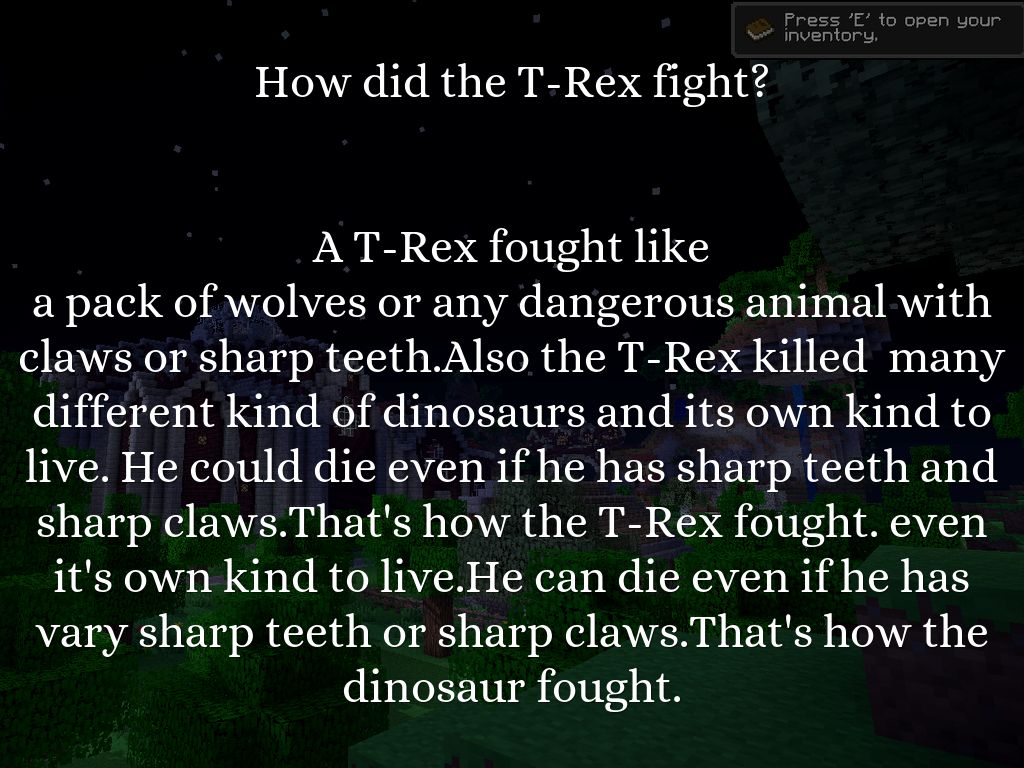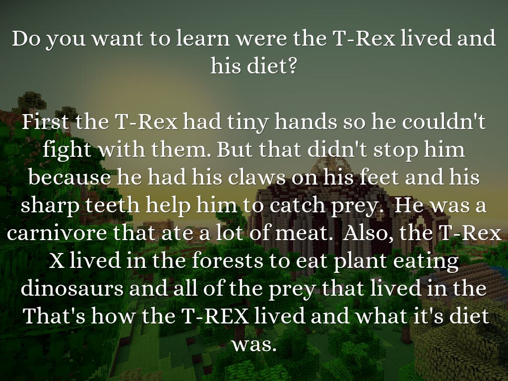 First the T-Rex had tiny hands so he couldn't fight with them. But that didn't stop him because he had his claws on his feet and his sharp teeth help him to catch prey. He was a carnivore that ate a lot of meat. Also, the T-Rex X lived in the forests to eat plant eating dinosaurs and all of the prey that lived in the That's how the T-REX lived and what it's diet was.