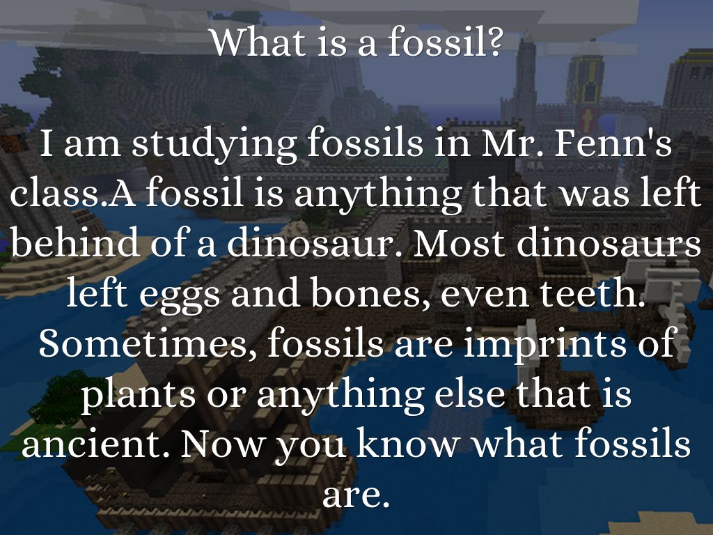 I am studying fossils in Mr. Fenn's class.A fossil is anything that was left behind of a dinosaur. Most dinosaurs left eggs and bones, even teeth. Sometimes, fossils are imprints of plants or anything else that is ancient. Now you know what fossils are.