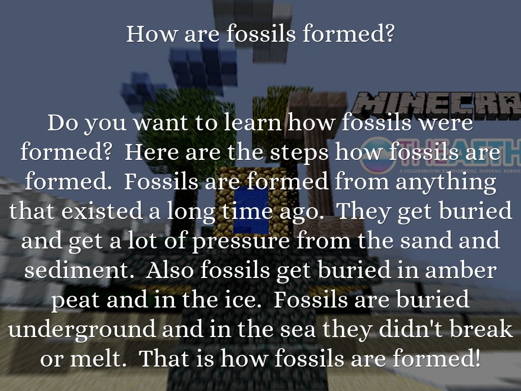 Do you want to learn how fossils were formed? Here are the steps how fossils are formed. Fossils are formed from anything that existed a long time ago. They get buried and get a lot of pressure from the sand and sediment. Also fossils get buried in amber peat and in the ice. Fossils are buried underground and in the sea they didn't break or melt. That is how fossils are formed!