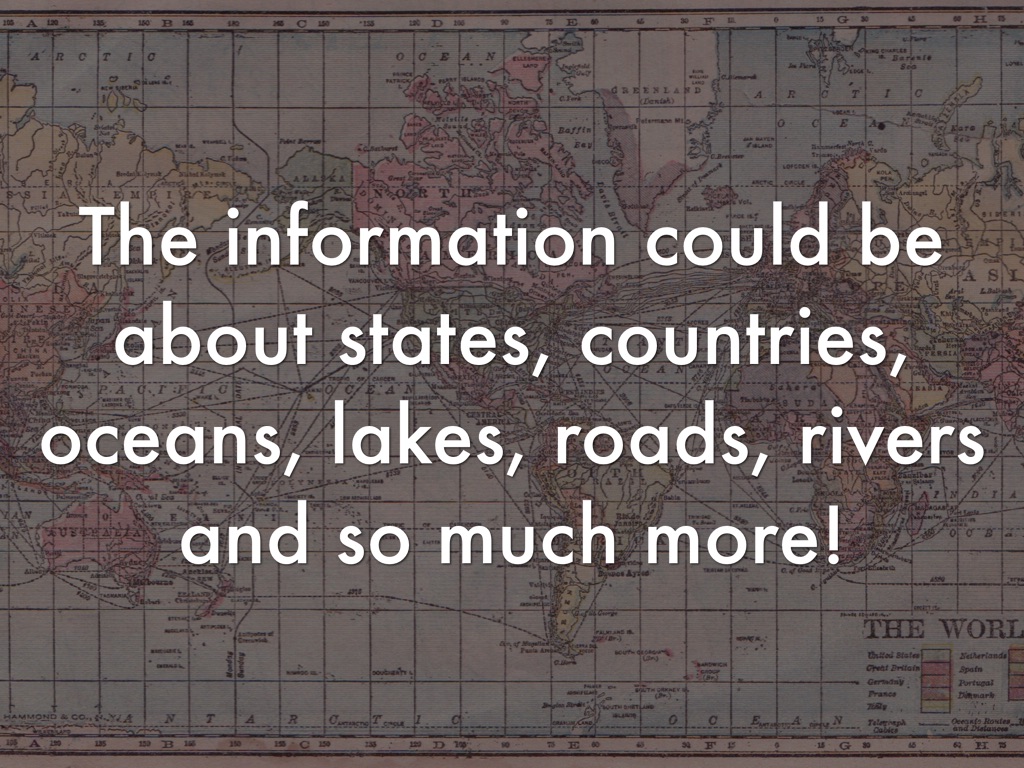 The information could be about states, countries, oceans, lakes, roads, rivers and so much more!