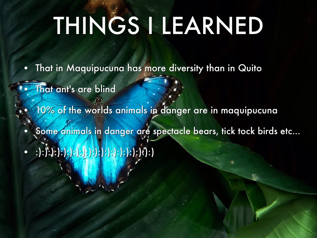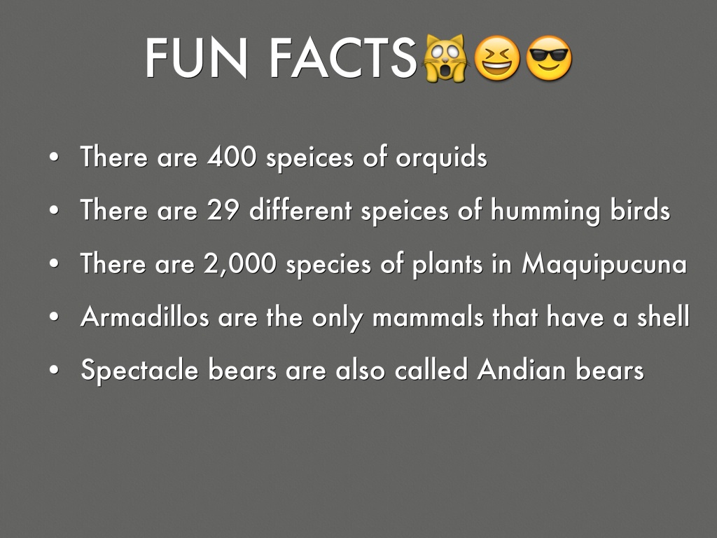 Some animals in danger are spectacle bears, tick tock birds etc...
