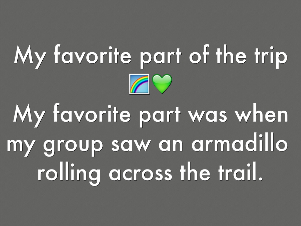 My favorite part was when my group saw an armadillo rolling across the trail.
