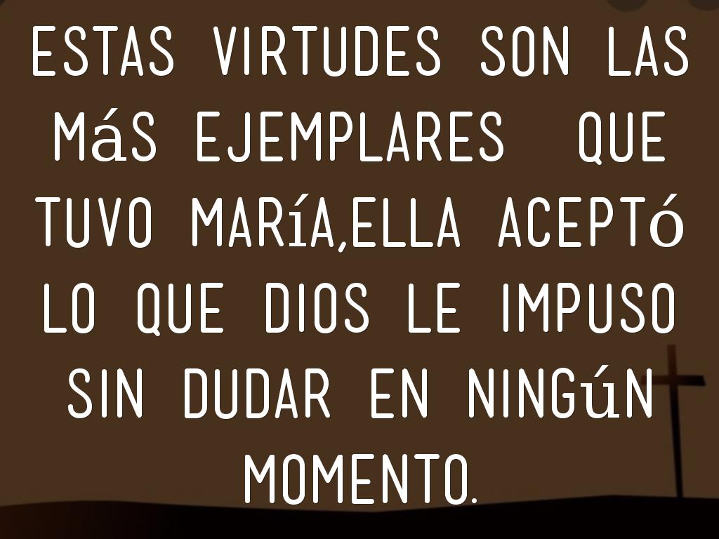 Estas virtudes son las más ejemplares que tuvo María,ella aceptó lo que Dios le impuso sin dudar en ningún momento.