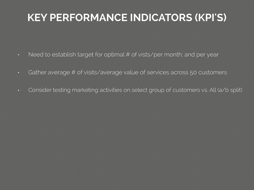 • Gather average # of visits/average value of services across 50 customers