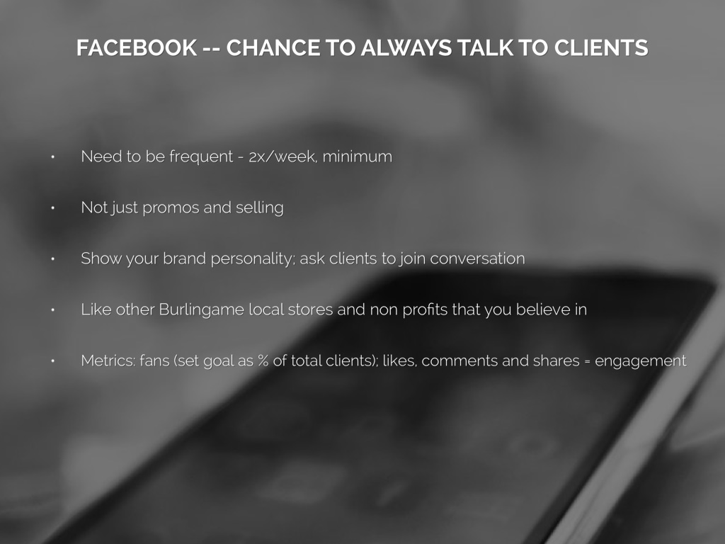 • Metrics: fans (set goal as % of total clients); likes, comments and shares = engagement