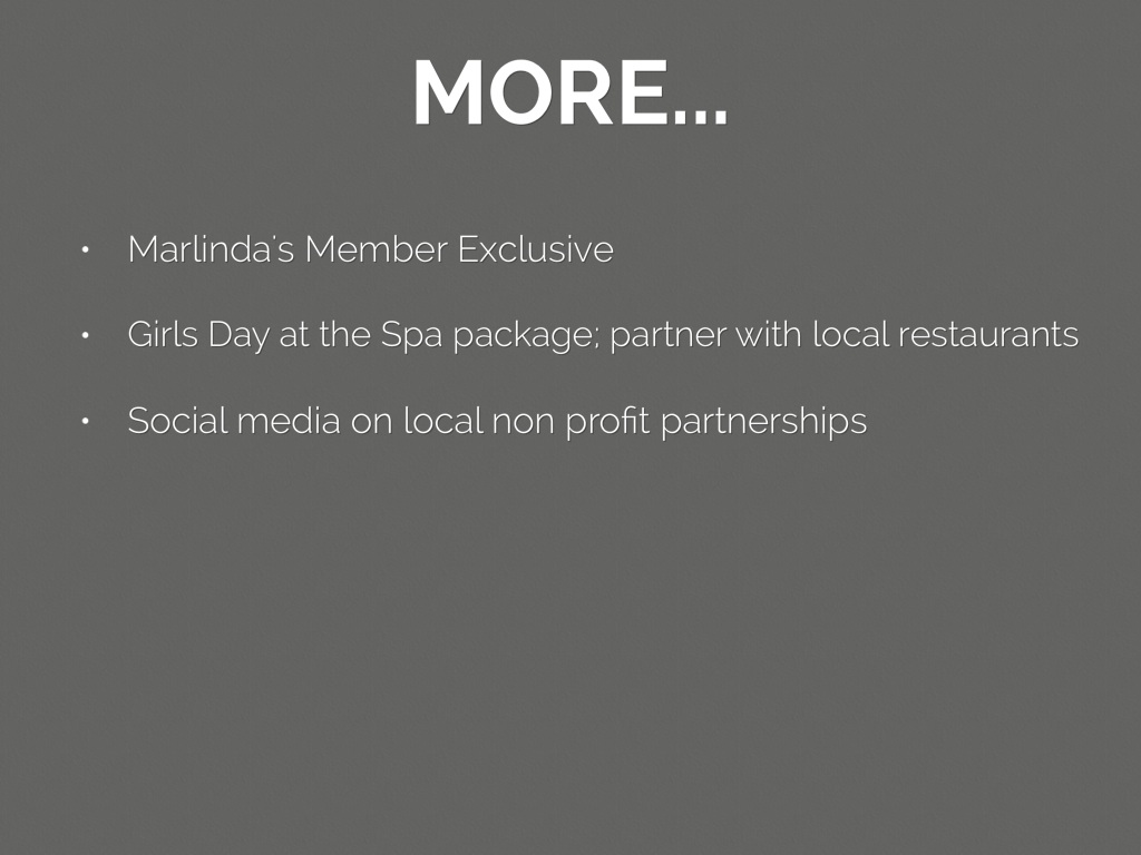 • Girls Day at the Spa package; partner with local restaurants