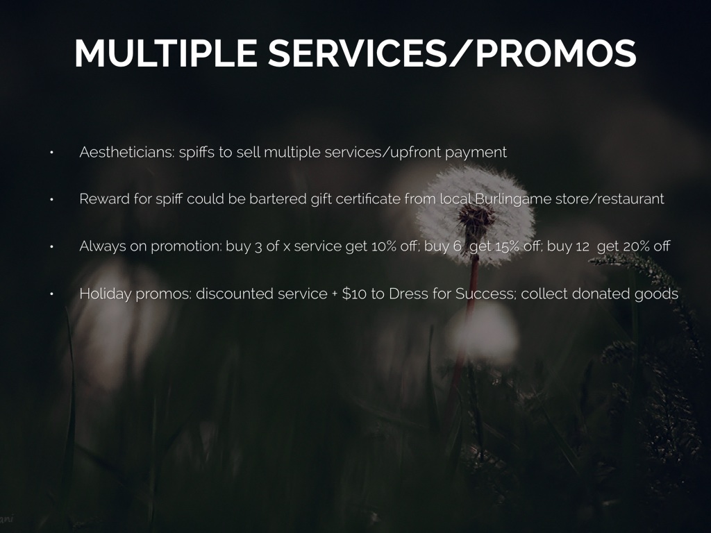 • Aestheticians: spiffs to sell multiple services/upfront payment