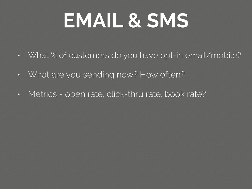 • Metrics - open rate, click-thru rate, book rate?