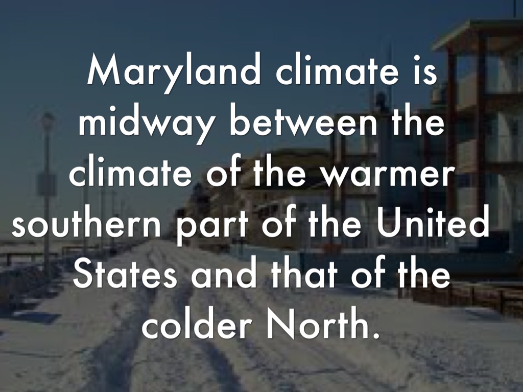 Maryland climate is midway between the climate of the warmer southern part of the United States and that of the colder North.