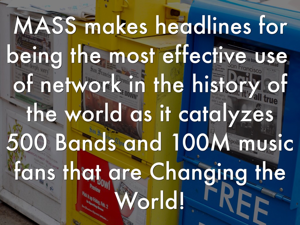 MASS makes headlines for being the most effective use of network in the history of the world as it catalyzes 500 Bands and 100M music fans that are Changing the World!