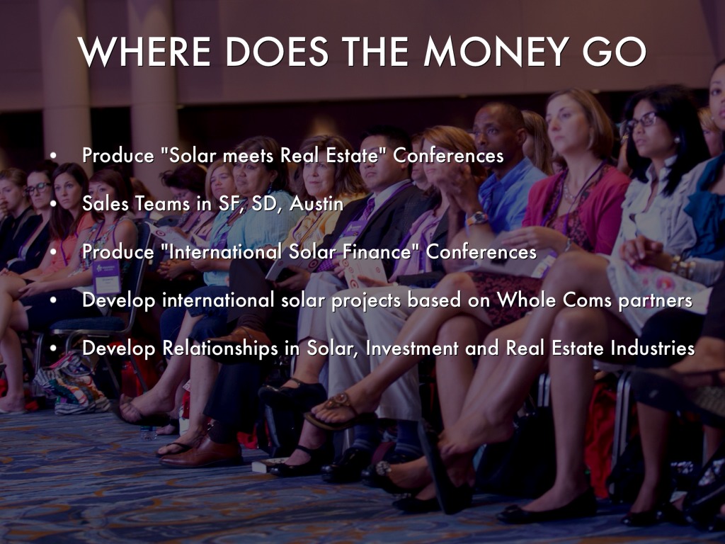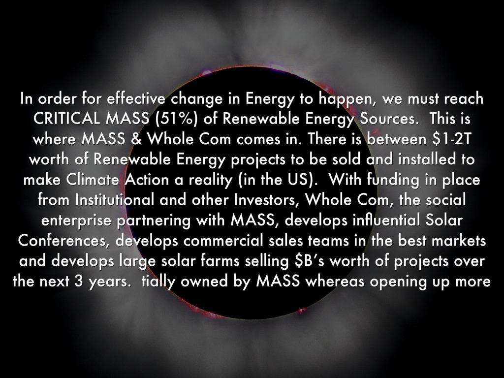 In order for effective change in Energy to happen, we must reach CRITICAL MASS (51%) of Renewable Energy Sources. This is where MASS & Whole Com comes in. There is between $1-2T worth of Renewable Energy projects to be sold and installed to make Climate Action a reality (in the US). With funding in place from Institutional and other Investors, Whole Com, the social enterprise partnering with MASS, develops influential Solar Conferences, develops commercial sales teams in the best markets and develops large solar farms selling $B’s worth of projects over the next 3 years. tially owned by MASS whereas opening up more