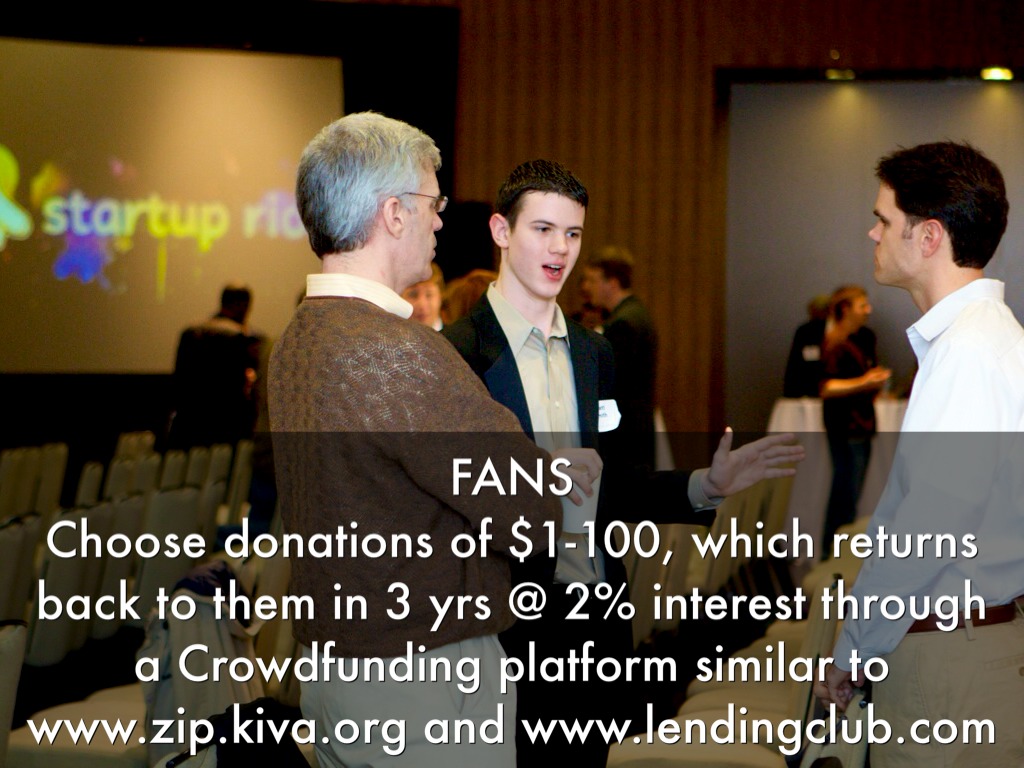 FANS Choose donations of $1-100, which returns back to them in 3 yrs @ 2% interest through a Crowdfunding platform similar to www.zip.kiva.org and www.lendingclub.com