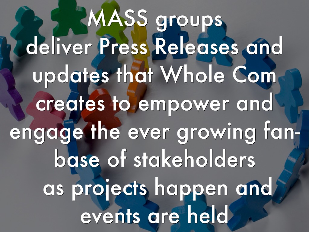 MASS groups deliver Press Releases and updates that Whole Com creates to empower and engage the ever growing fan-base of stakeholders as projects happen and events are held