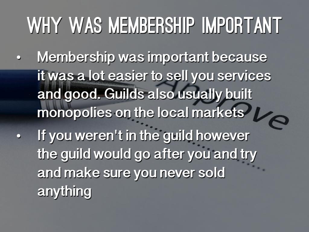 Membership was important because it was a lot easier to sell you services and good. Guilds also usually built monopolies on the local markets