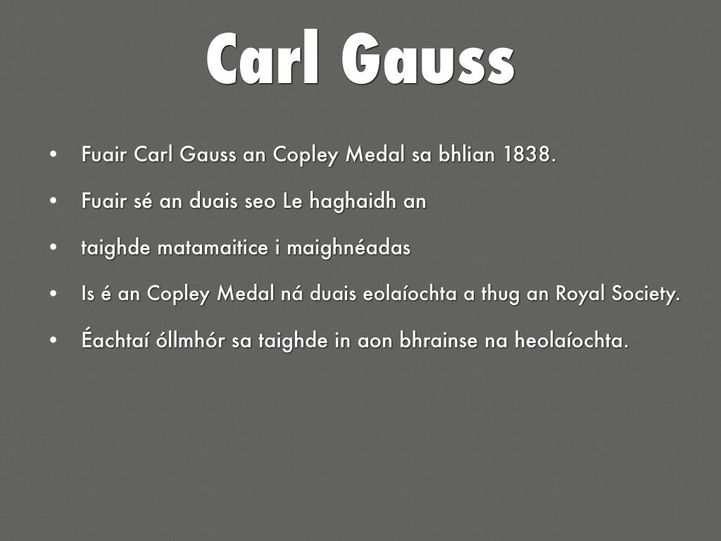 • Fuair Carl Gauss an Copley Medal sa bhlian 1838.