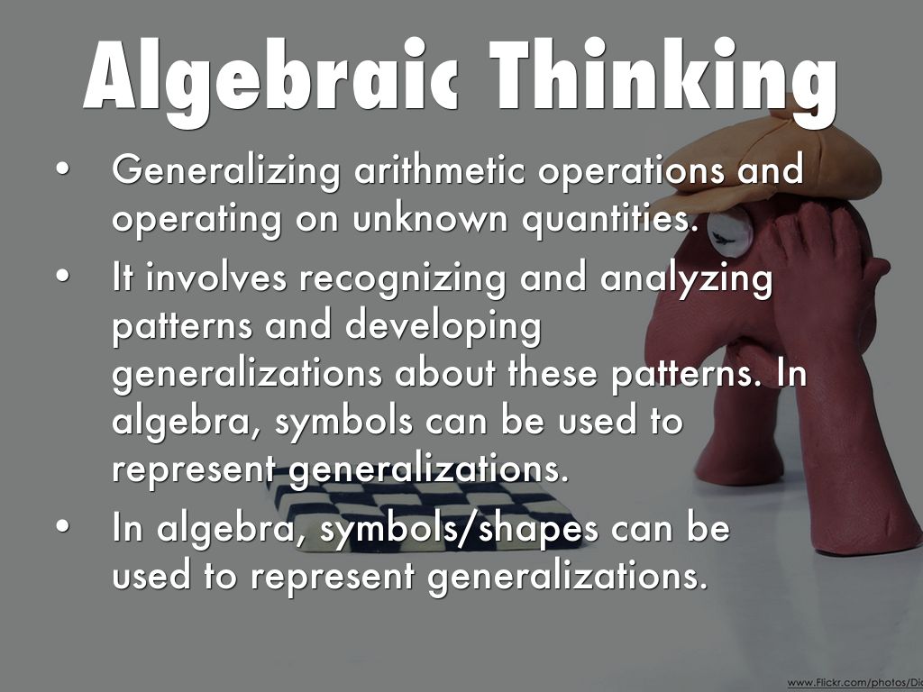• It involves recognizing and analyzing patterns and developing generalizations about these patterns. In algebra, symbols can be used to represent generalizations.