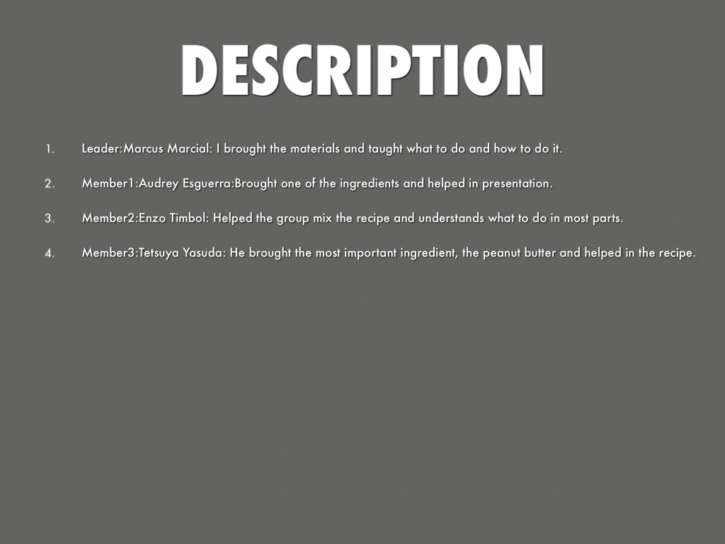 Member1:Audrey Esguerra:Brought one of the ingredients and helped in presentation.