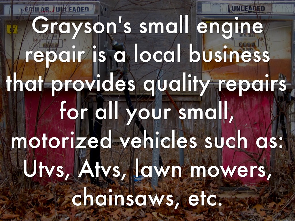 Grayson's small engine repair is a local business that provides quality repairs for all your small, motorized vehicles such as: Utvs, Atvs, lawn mowers, chainsaws, etc.