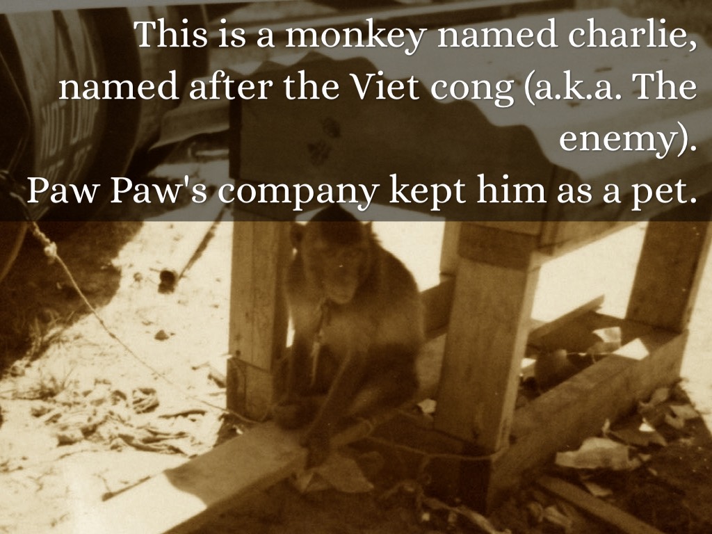 This is a monkey named charlie, named after the Viet cong (a.k.a. The enemy).