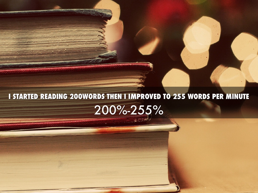 I STARTED READING 200WORDS THEN I IMPROVED TO 255 WORDS PER MINUTE