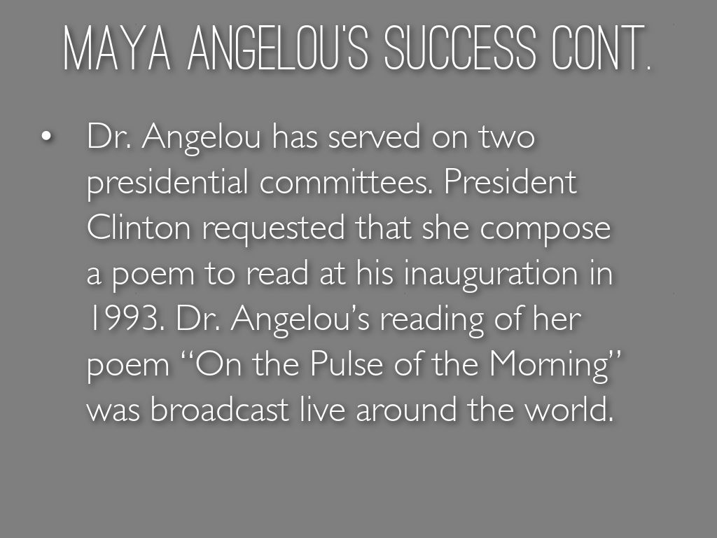 Dr. Angelou has served on two presidential committees. President Clinton requested that she compose a poem to read at his inauguration in 1993. Dr. Angelou’s reading of her poem “On the Pulse of the Morning” was broadcast live around the world.