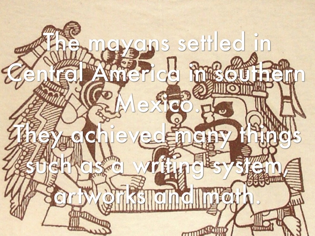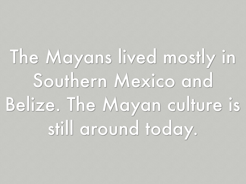 The Mayans lived mostly in Southern Mexico and Belize. The Mayan culture is still around today.