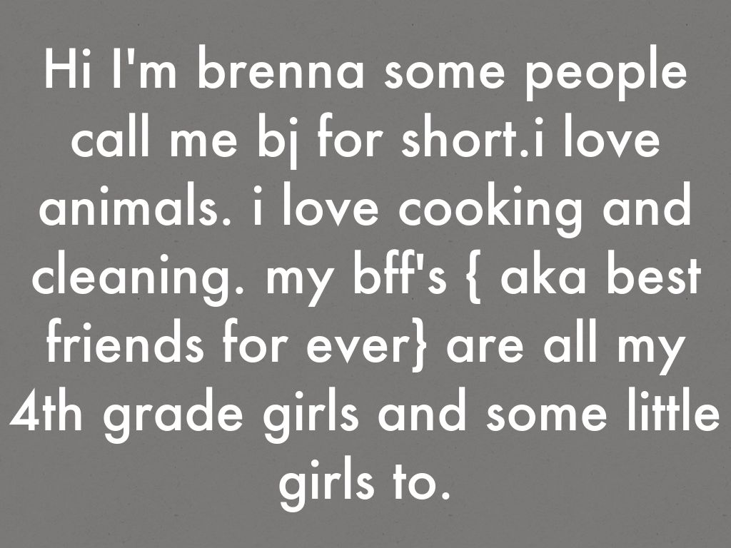 Hi I'm brenna some people call me bj for short.i love animals. i love cooking and cleaning. my bff's { aka best friends for ever} are all my 4th grade girls and some little girls to.