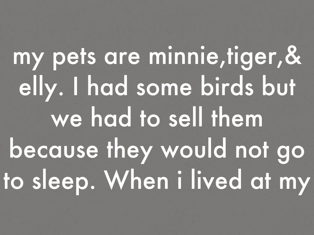 my pets are minnie,tiger,& elly. I had some birds but we had to sell them because they would not go to sleep. When i lived at my