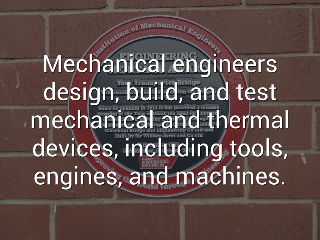 Mechanical engineers design, build, and test mechanical and thermal devices, including tools, engines, and machines.