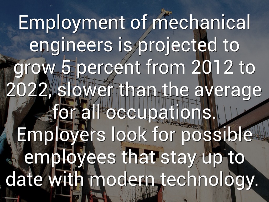 Employment of mechanical engineers is projected to grow 5 percent from 2012 to 2022, slower than the average for all occupations. Employers look for possible employees that stay up to date with modern technology.