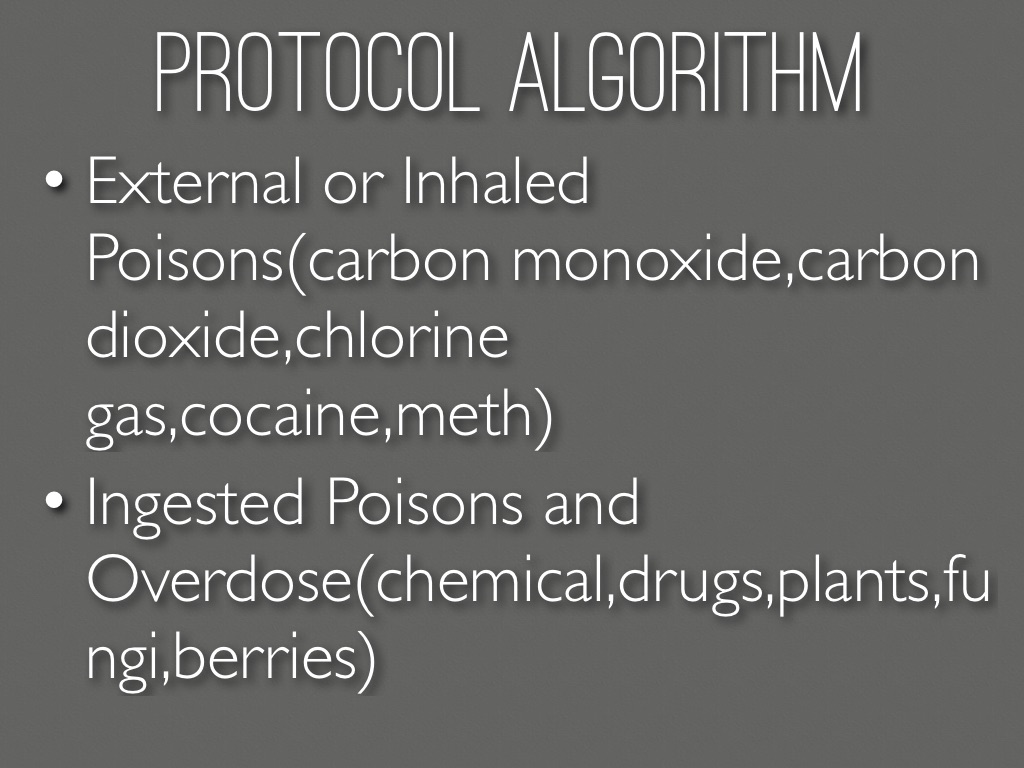 • External or Inhaled Poisons(carbon monoxide,carbon dioxide,chlorine gas,cocaine,meth)